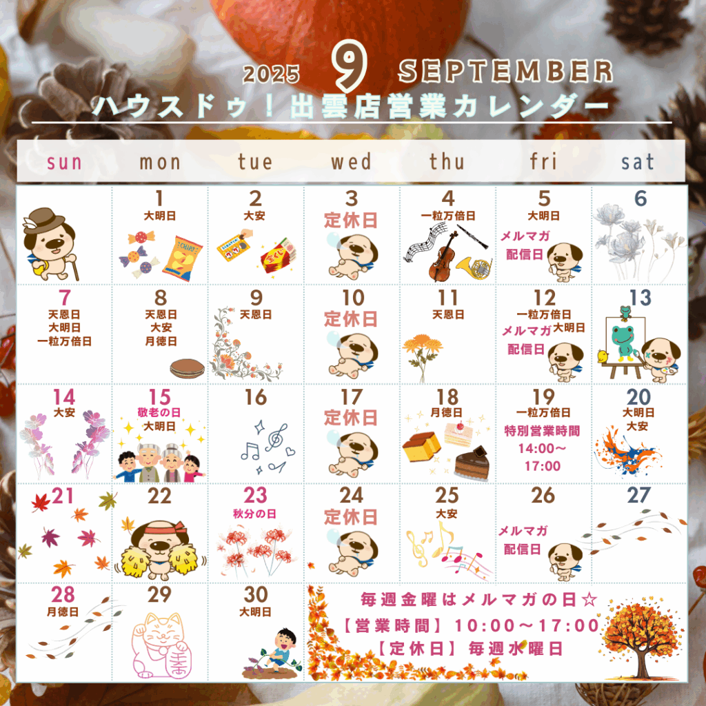 ■何をやっても良い日とされている大安の営業日は9/2(火)・8(月)・14(日)・20(土)・25(火)です!