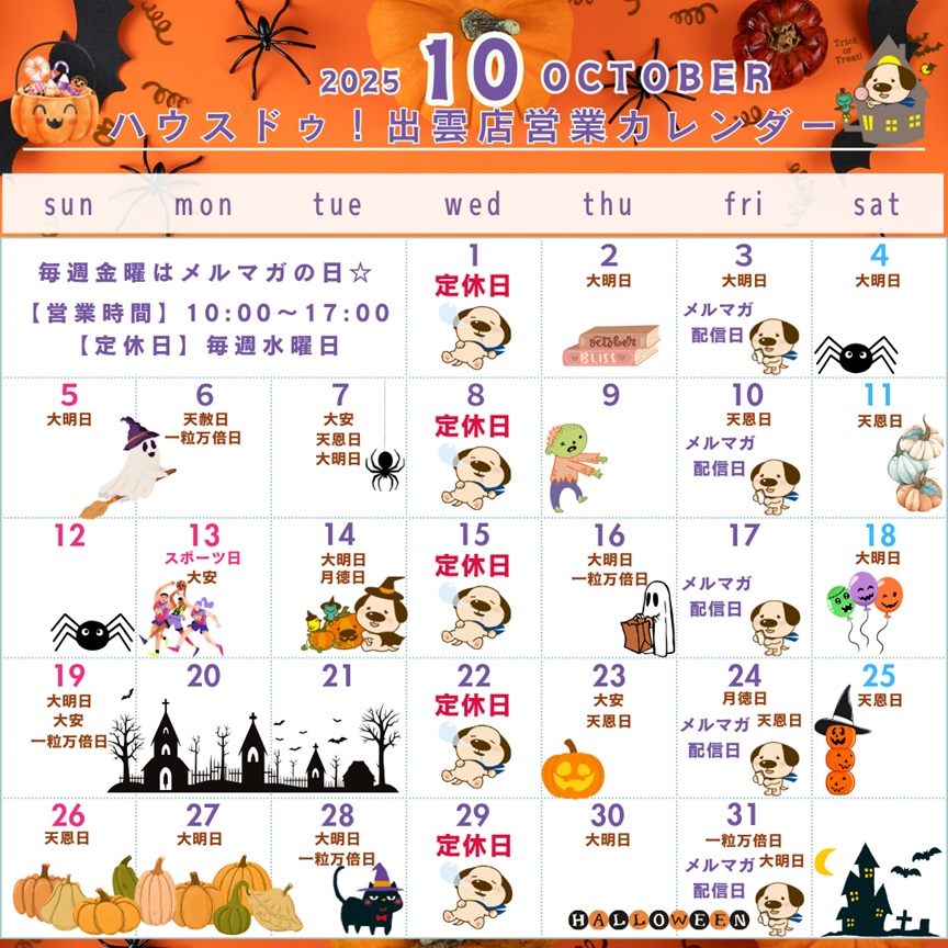 ■あらゆることに大吉!引っ越し、旅行など、移動に関わることや普請によいとされる大明日の営業日は10/2(木)~5(日)・7(火)・10(金)・11(土)・14(火)・16(木)・18(金)・19(日)・27(月)・28(火)・30(木)・31(金)です!